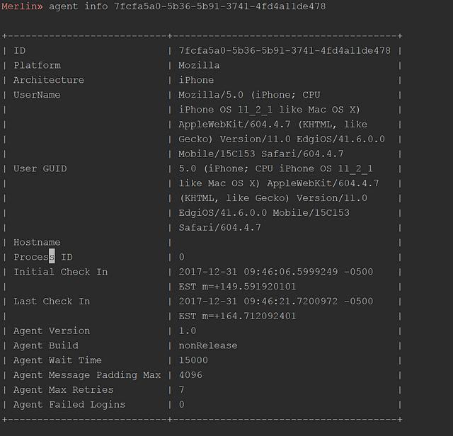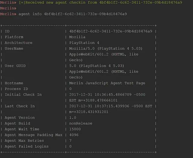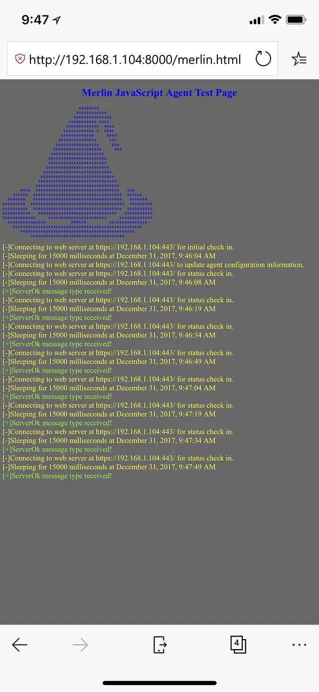 TheΒ Merlin JavaScript AgentΒ functions the same as other agents. It is controlled through the server using the same commands. It is important to note that theΒ Merlin JavaScript AgentΒ is only capable of executing JavaScript commands. However, I plan on developing functionality to include common use cases such as options for port scanning or key logging. For example, you could executeΒ 2+2Β and the agent will returnΒ 4. Alternatively, you can executeΒ alert(βMerlin')Β and a JavaScript alert box will appear on the page where the Merlin Agent is running. See the video and Wiki for a demo of running JavaScript commands in Merlin.