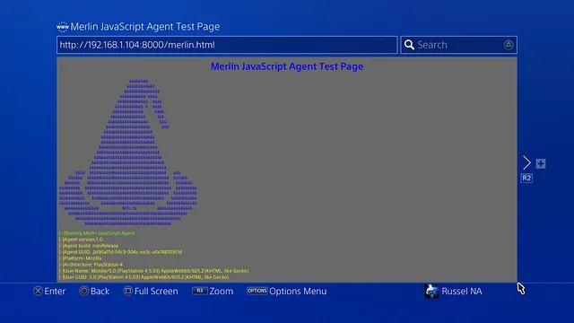 Merlin ships with an HTML page that can be used to test theΒ Merlin JavaScript Agent. It can be found atΒ data/html/merlin.html. This page will automatically load theΒ Merlin JavaScript Agent, connect to the Merlin Server, and start writing verbose messages to the screen. The quickest way to try this out it is to use Python and start a simple web server in theΒ htmldirectory (i.e.Β cd data/html;python -m SimpleHTTPServer) and then browse to the page atΒ http://127.0.0.1:8000/merlin.html.Β The figure below illustrates an example of the test page being accessed on a PlayStation to execute the Merlin JavaScript agent. Additional images can be foundΒ here.