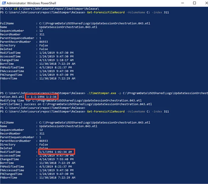 In my testing, I show the file record for a file before and after timestomping. I will also show how to detect timestomping using Sysmon.