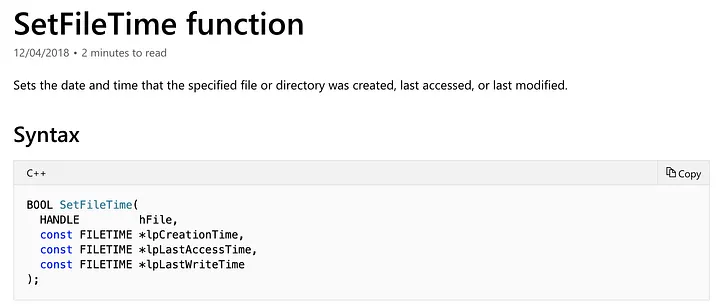 TimeStomper’s main functionality comes from the SetFileTime() API shown below: