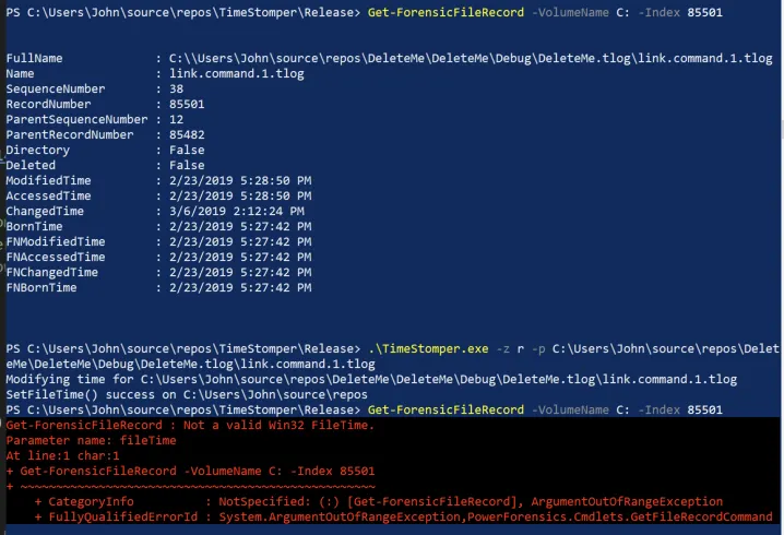 Here we see that Get-ForensicFileRecord is able to see the changes made to the ModifiedTime attribute.