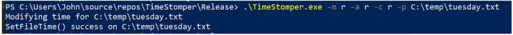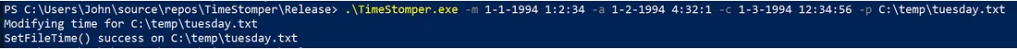 TimeStomper.exe -m 1-1-1994 1:2:34 -a 1-2-1994 4:32:1 -c 1-3-1994 12:34:56 -p C:\temp\Tuesday.txt