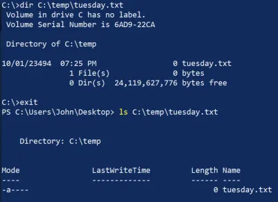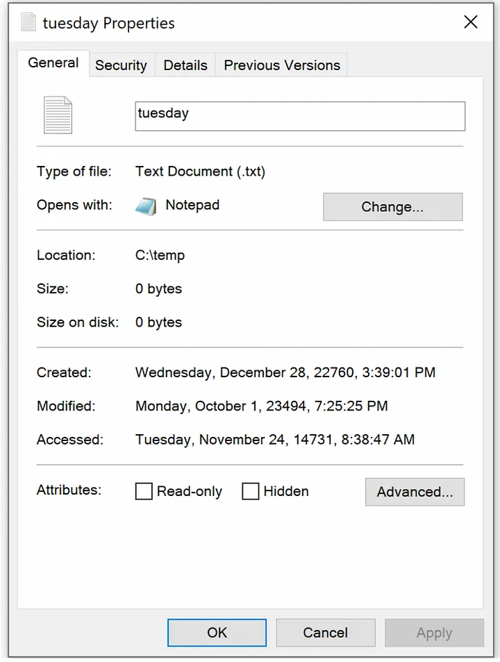 This will change last modified time for C:\temp\Tuesday.txt to January 1st, 1994 01:02:34 AM UTC, last accessed time to January 2nd, 1994 04:32:01 AM UTC, creation time to January 3rd, 1994 12:34:56 PM UTC.