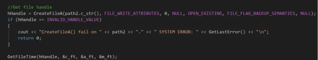 TimeStomper also has the ability to copy a time from a file/folder on disc to a target file/folder. This is accomplished by opening a handle to the file/folder that we want to mimic with the CreateFileA() API. With the appropriate handle, we are able to call the GetFileTime() API to obtain three FILETIME structures which are compatible with the SetFileTime() API.