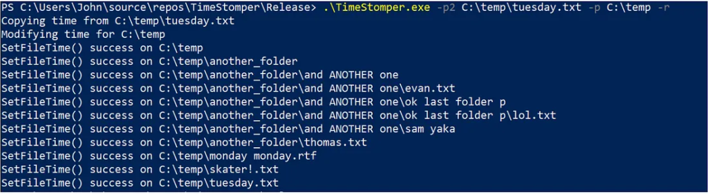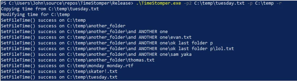 TimeStomper.exe -p2 C:\temp\tuesday.txt -p C:\temp -r