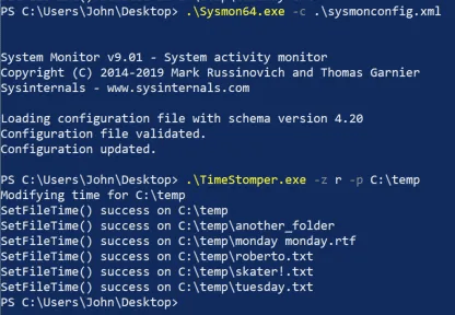 The PoC can be found here: https://github.com/justinbui/TimeStomper. I’ve also included a Sysmon config file created by Roberto Rodriguez to help detect timestomping.