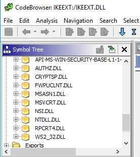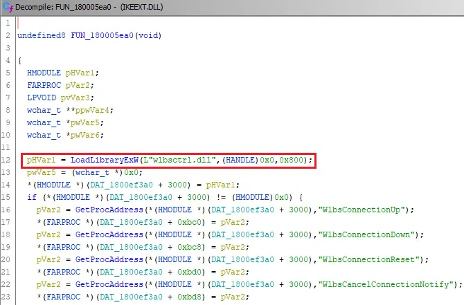 I then threw this file into a Ghidra to begin analyzing the IKEEXT.dll. The first place one looks when searching for these LoadLibrary calls is in the PE’s import table. This table defines function dependencies in other Portable Executables (PEs) on disk. Unfortunately the wlbsctrl.dll was not referenced in the import table, and upon reflection this is to be expected. The reason being is that if it were referenced, we should have expected to see svchost.exe searching not only C:\Windows\System32\, but every directory in the PATH environment variable as well (defined in the load library specification here).