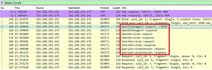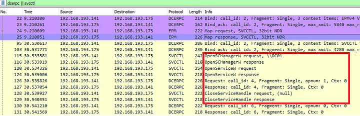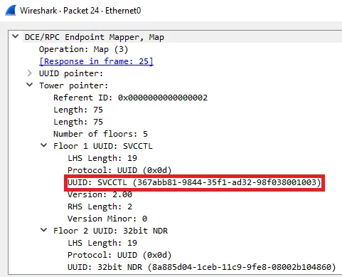 Network-based detections should monitor the negotiation of RPC UUID {367ABB81–9844–35F1-AD32–98F038001003} over port 135. This UUID denotes the Service Control Manager. This opens a new named pipe, SVCCTL, for the client to communicate with over port 445 in order to control the desired service.