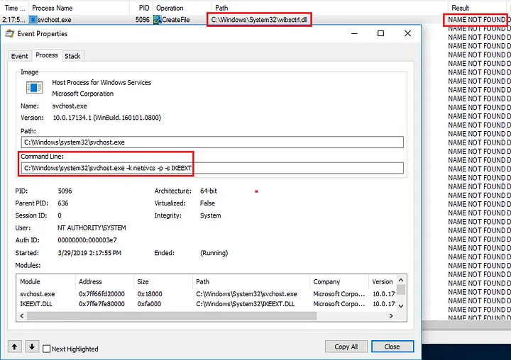 IKEEXT hosts the Internet Key Exchange (IKE) and Authenticated Internet Protocol (AuthIP) keying modules. When the service is started, it searches for the file wlbsctrl.dll. This is the first indicator that the service is potentially abusable.