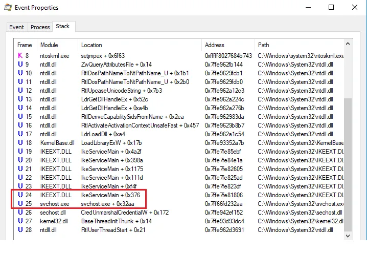 Viewing the stack tab of the event properties we can see exactly how svchost.exe was called and what files may be attempting to call LoadLibrary on the wlbsctrl.dll file. Doing so reveals that IKEEXT.DLL is directly above svchost.exe in the stack frame and is a perfect candidate for further analysis.