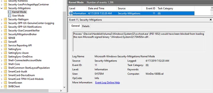 Starting in Windows 10, Microsoft introduced Exploit Guard which allows you to “manage and reduce the attack surface of apps used by your employees.” Exploit Guard introduced several new event streams including one for non-Microsoft-signed binary loads. If one were to apply this event (Event ID 11) to svchost.exe, they would be able to extract both the PID and path to the non-Microsoft-signed PE that would be loaded. While this is sure to cause noise at first, tuning this data source could prove to be a potent detection. A full list of Exploit Guard’s events can be found here.