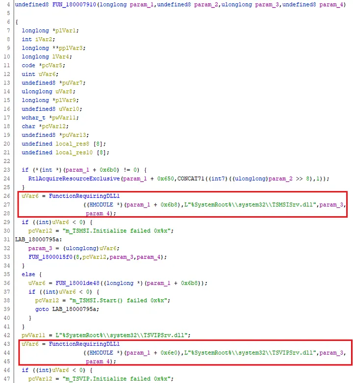 Once again, these files aren’t searched for recursively using the DLL search order specification; rather, they must be called directly by name somewhere within the calling library, SessEnv.dll. Using the string reference method as above we are dropped into a singular function that references both TSMSISrv.dll and TSVIPSrv.dll by name.