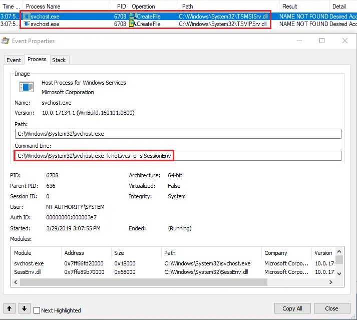 Applying the same methodology from IKEEXT to the SessionEnv service, we are greeted with two DLLs being queried by svchost.exe: TSMSISrv.dll and TSVIPSrv.dll.