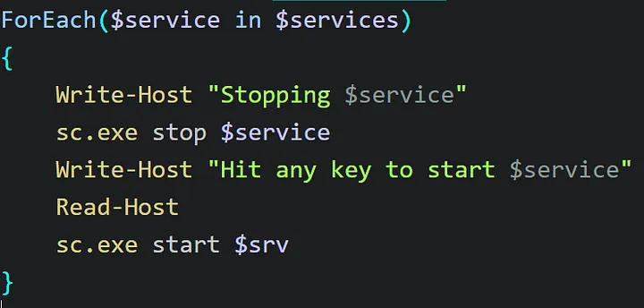 To monitor these services in a fine-grained manner, I needed some degree of control over their start and stop times in order to correlate the information I saw in Procmon with the service being started. My solution was to use a simple PowerShell for-loop such that I could clear my event log between each service restart, and trigger each restart with a keystroke.