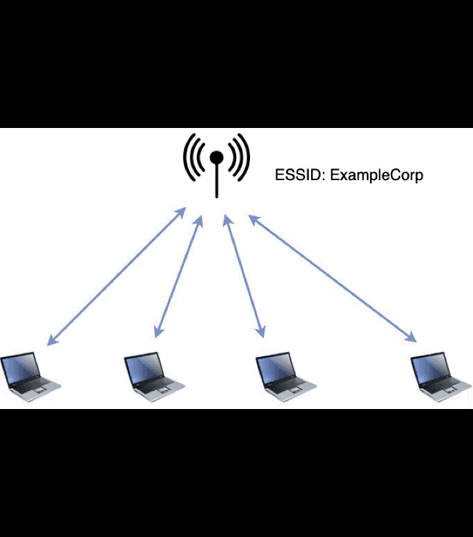 - Extended Service Set (ESS) (aka “Infrastructure” network): Infrastructure networks will be the primary focus of this writeup, so pay attention to this part. BSS’s within infrastructure networks consist of zero or more stations connected to an access point, and are identified by their Basic Service Set Identifier (BSSID). The Extended Service Set (ESS) itself is comprised of one or more BSS’s joined by a common Distribution System (DS). The DS itself can be any sort of wired or mesh network that links the access points together [4].