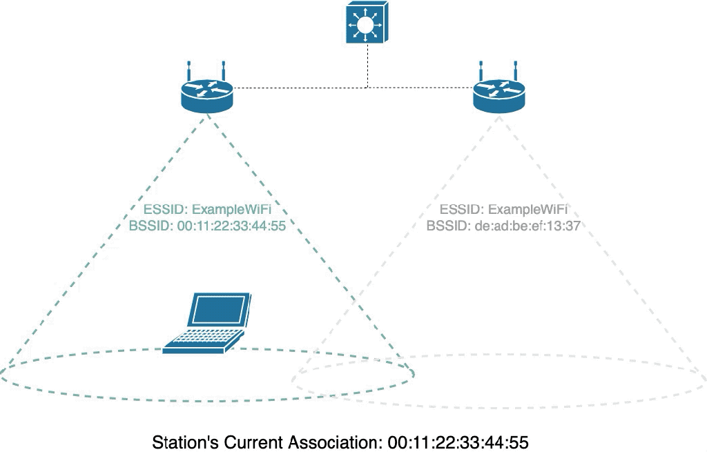 As previously mentioned, the 802.11 protocol allows stations to roam freely between access points within the same ESS. However, the standard does not specify how stations should select an AP to connect to when multiple APs within the station’s ESS are available. Client devices are typically optimized to respond to this situation by selecting the access point that provides the best connection, which usually boils down to a combination of signal strength, throughput, and signal to noise ratio. As with automatic network selection, client devices rely on beacon frame ESSID fields to determine what nearby APs are part of their current ESS [5][6].