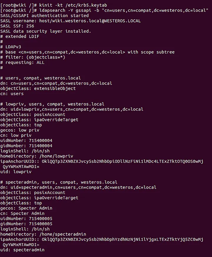 ldapsearch -Y gssapi -b "cn=users,cn=compat,dc=westeros,dc=local"