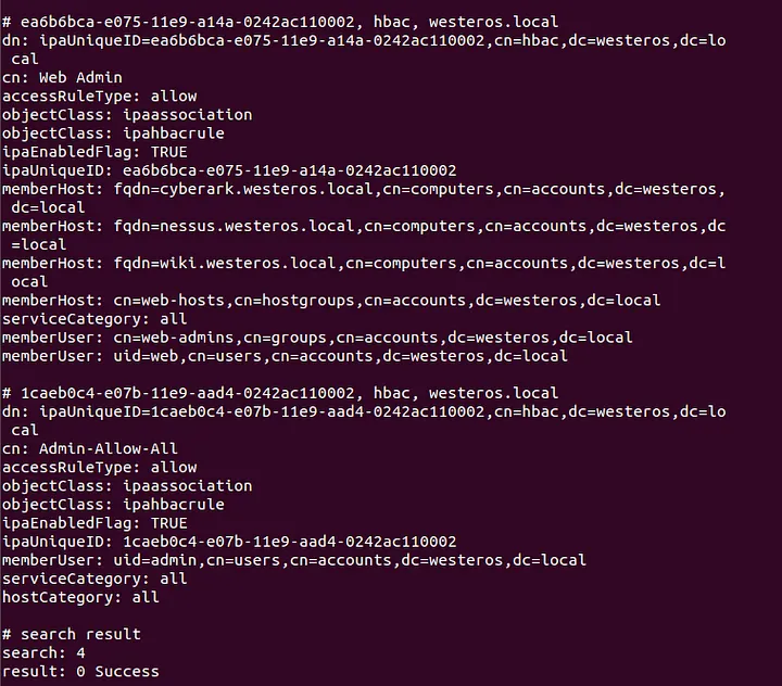 ldapsearch -Y gssapi -b "cn=hbac,dc=westeros,dc=local"