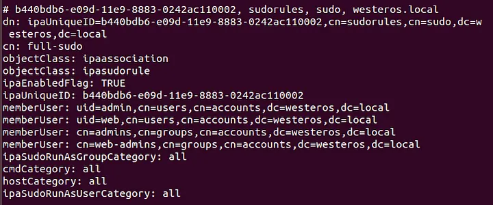 ldapsearch -Y gssapi -b "cn=sudorules,cn=sudo,dc=westeros,dc=local"