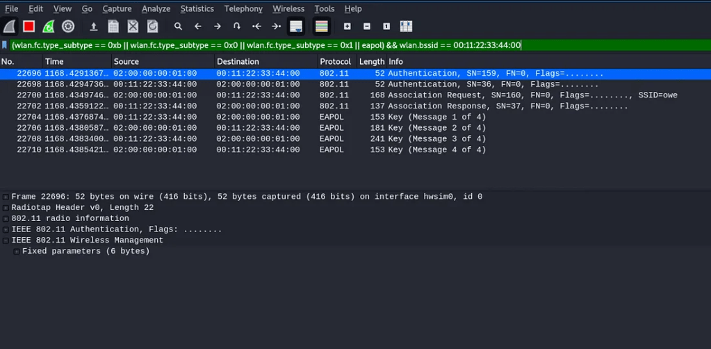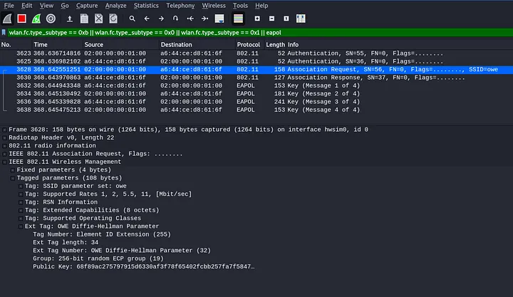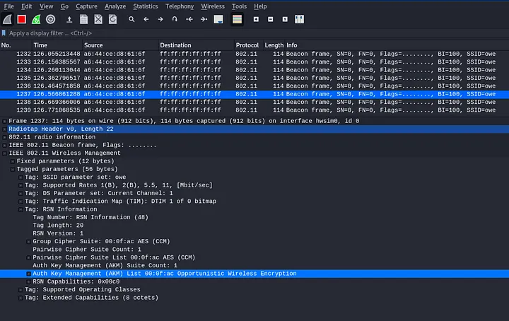 Next, use confirm hostapd has correctly created an OWE access point as shown in the following screenshot (for a more detailed explanation of what we’re looking for with Wireshark, see Part II).