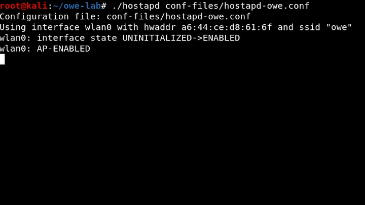From your owe-lab directory, begin creating an OWE access point on wlan0 by passing the config file found at conf-files/hostapd-owe.conf to hostapd. Note that this is the same config file we used in Part II of this series. If you’re interested what this config file is doing, you can find a detailed explanation there.