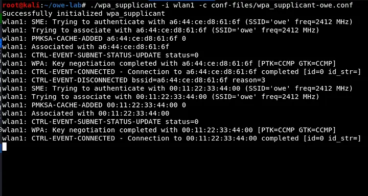 Next, pass the config file found at conf-files/wpa_supplicant-owe.conf to wpa_supplicant to connect wlan1 as a client device to the AP running on wlan0.
