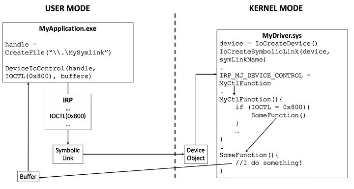 DeviceIoControl()to send the required IOCTL and input/output buffers to the symlink. - The symlink points to the driver’s device object and allows the driver to receive the user mode application’s packet (IRP)