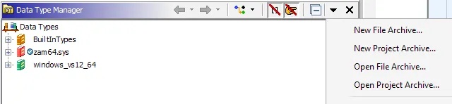 To import and begin using the GDT file, open the driver you want to start analyzing, click the Down Arrow (▼) in the Data Type Manager and select “Open File Archive.”