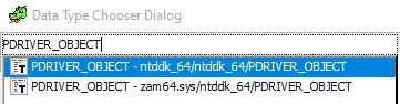 This becomes a lot easier with our newly-applied symbols. Since we know that the first parameter of DriverEntry is a pointer to a driver object, we can click the parameter in the decompiler and press CTRL+L to bring up the Data Type Chooser. Search for PDRIVER_OBJECT and click OK. This will change the type of the parameter to match its true type.