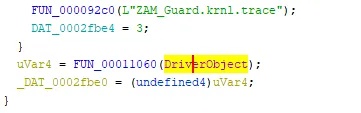 Start looking for occurrences of the DriverObject variable. This is really easy if you have a mouse. Just click the mouse wheel over the variable to highlight all instances of the variable in the decompiler. In the example I am working with, I don’t see references to offsets from the driver object, but I do see it being passed to another function.