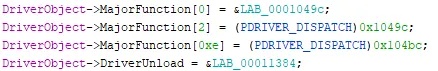 Then again start searching for references to offsets from the DriverObject variable. Here’s what we’re looking for: