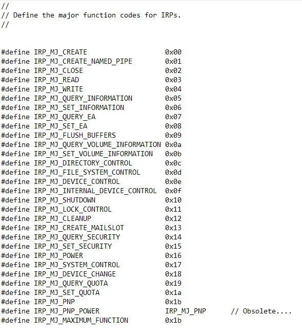 The most important major function for us in almost all cases will be IRP_MJ_DEVICE_CONTROL as it is used to send requests to perform a specific internal function from user mode. These requests include an IO Control Code which tells the driver exactly what to do, as well as a buffer to send data to and receive data from the driver.