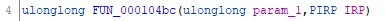 Let’s dig into this function. Double-click the offset for MajorFunction[0xe]. This will take you to the function at offset 0x104bc in the driver. The second parameter of this function, and all device I/O control IRP handlers, is a pointer to an IRP. We can again use the CTRL+L to retype the second parameter to PIRP (and optionally rename it).
