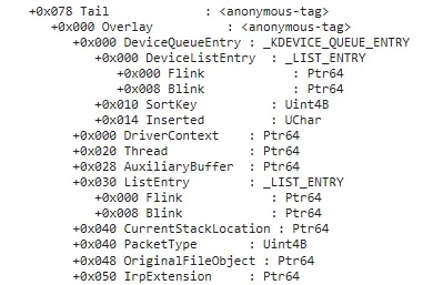 We can see that Tail begins at offset +0x78but what is 0x40 bytes beyond that? Using WinDbg, we can see that CurrentStackLocation is at offset +0x40 from Irp->Tail, but it only shows as a pointer.