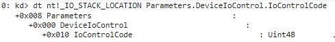 The IRP structure is incredibly complex and even with the help of our new type definitions, we still won’t be able to pinpoint everything. The first and most important thing we are going to want to look for is IOCTLs. These will be represented as DWORDs inside the decompiler, but we need to know which variable they’re assigned to. To figure that out, we’ll need to rely on our old friend WinDbg.