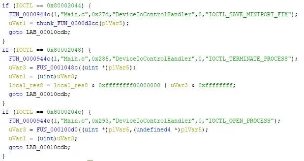 These comparisons are the driver checking for the IOCTLs that it can handle. After each comparison will most likely be an internal function call. These are what will be executed when that specific IOCTL is sent to the driver from user mode! In the above example, when the driver receives IOCTL 0x8000204c, it will execute FUN_0000944c (some type of printing function) and FUN_000100d0.