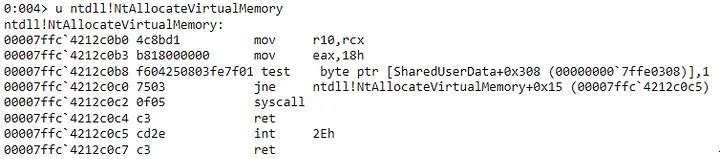 As you can see, there’s jump to 0x7ffc01e60168 (the 3 breakpoint traps following the jump are insignificant) thrown in the middle. This is commonly referred to as a trampoline. This trampoline diverts execution to an alternative function, likely a DLL injected by an EDR to collect information. This function inside the DLL will execute the real function on behalf of the user and may observe any return values.