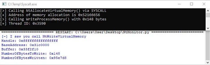 To test our evasion, I replaced the call to VirtualAlloc() in the SimpleCRT.exe PoC from above with our SYSCALL code and ran it through our Frida script. The call to WriteProcessMemory() is detected as it wasn’t modified, but it wasn’t able to catch our memory allocation 😎