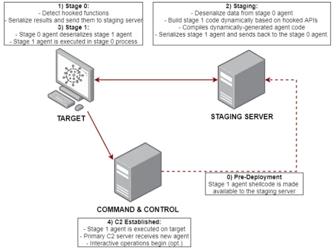 The server receives the data from Stage 0 and dynamically generates and compiles Stage 1 which only uses API calls which aren’t hooked and SYSCALLs for those which are. The server sends this compiled Stage 1 back to Stage 0, which loads and calls Stage 1’s entry point.