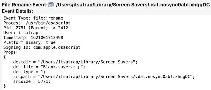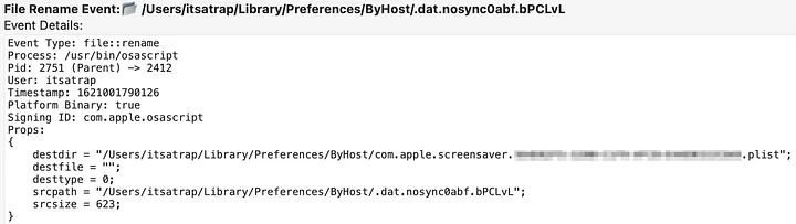 An adversary could perform the plist modification tasks off-target and upload the modified plist to the ~/Library/Preferences/ByHost/com.apple.screensaver.[Hardware-UUID].plist location to reduce the number of potential indicators. However, this will still result in the file::rename event. In the example above, osascript was the process performing this modification which is abnormal compared to the normal cfprefsd process. Modifications of the plist outside of the cfprefsd process may be a good starting point for identifying malicious behavior.