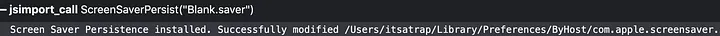 Like my Dock persistence method, this technique relies on the ability end-users have to modify a property list (plist). Plists are the macOS equivalent of the Windows registry. By changing the values in the screensaver plist (~/Library/Preferences/ByHost/com.apple.screensaver.[Hardware-UUID].plist), an adversary can set a new screensaver and set configuration options such as the user inactivity time. The culmination of this research is ScreenSaverPersist.js, which I have included in the PersistentJXA project.