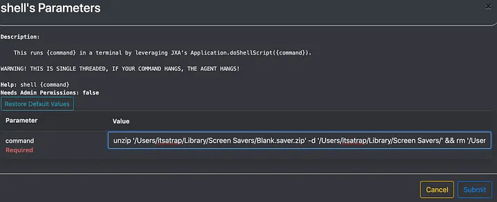 Now with the malicious screensaver saved to ~/Library/Screen Savers/, we invoke persistence. To do so, we import the script into the Apfell agent.