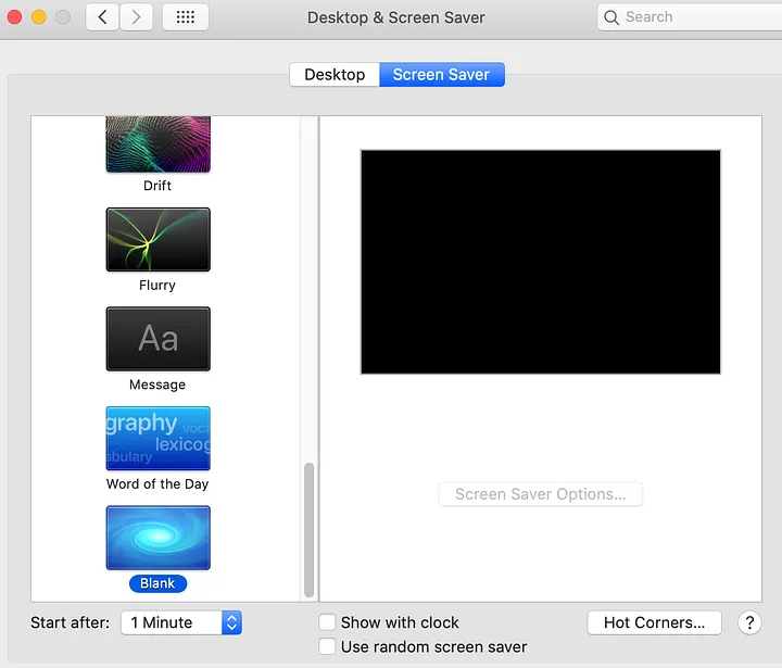 After running the function, if we go back to the system preferences pane, you’ll notice that the active screen saver changed to Blank, and the time changed from 20 minutes to 1 minute.