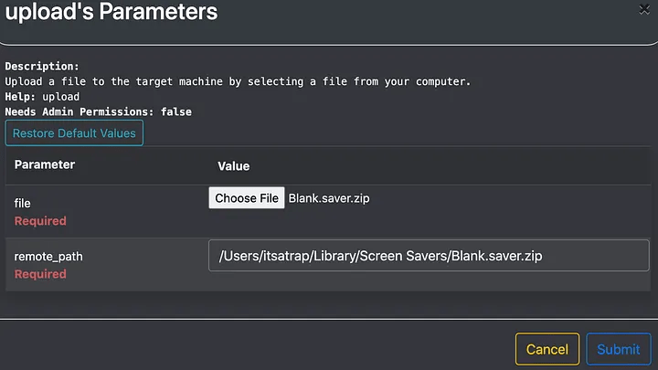 This persistence method requires the malicious .saver to be uploaded to the target. We can simply use the upload feature within the Apfell agent to save this on disk. There are three folders in which screensaver files are loaded from/System/Library/Screen Savers/ , Library/Screen Savers/ , and~/Library/Screen Savers/. These folders are for the default screensavers that ship with macOS (SIP protected folder), system-wide screensavers (all users and requires root), and screensavers for the current user, respectively.