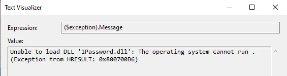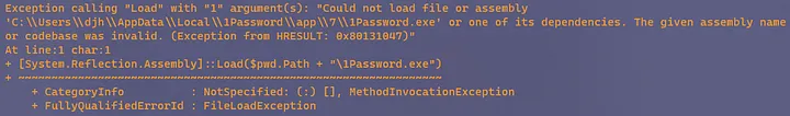 When I attempted to reflectively load the 1Password assembly however, I was greeted with another lovely error message. Analyzing this in retrospect, I probably could’ve predicted this since I couldn’t load the DLL dependency that 1Password.exe relies on, but oh well. You live and you learn.