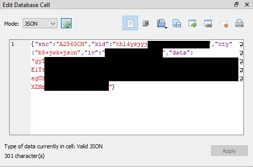 Another somewhat naive approach is to parse the binary for strings and byte arrays. We know that the credential material is stored as a JSON string within the 1Password SQLite database. The raw bytes of that JSON string are returned to the caller via decrypt_with_vault_id, and that is parsed into a Newtonsoft.Json.Linq.JObject.